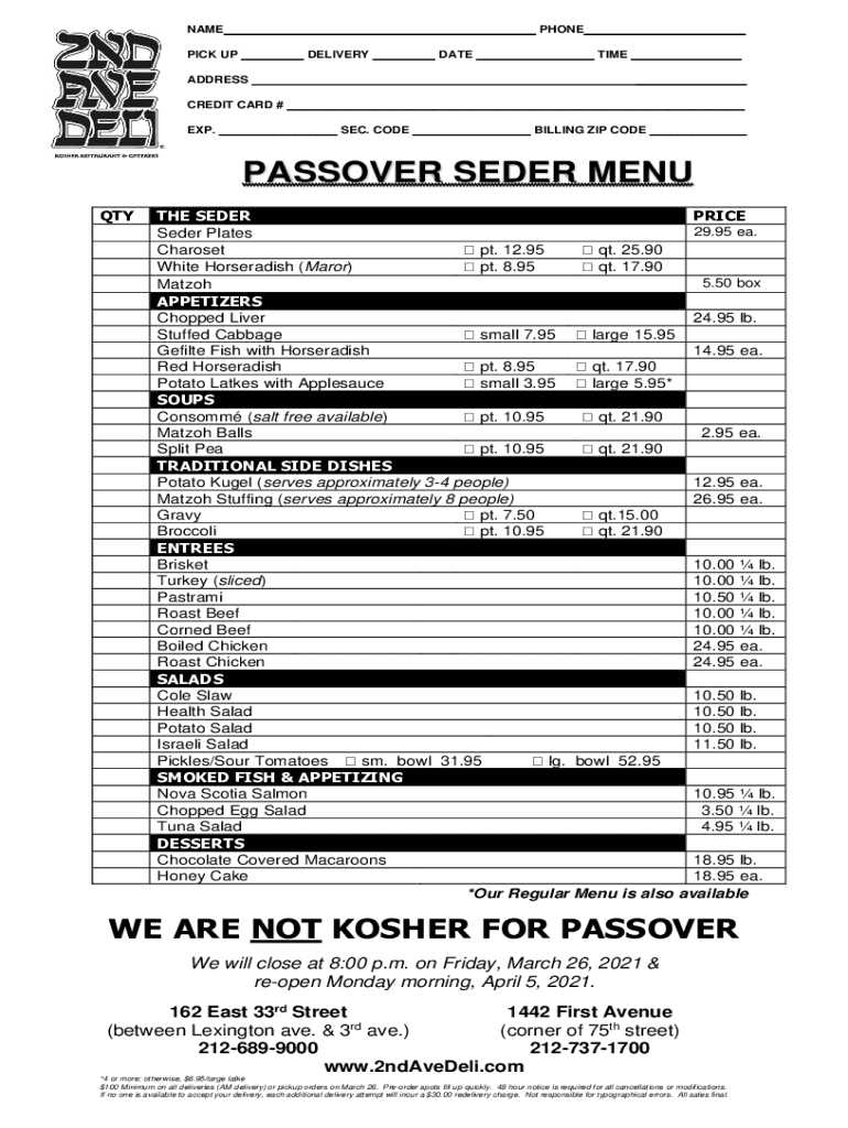 NAME PHONE PICK UP DELIVERY DATE TIME ADDRESS CREDIT CARD # EXP. SEC. CODE BILLING ZIP CODE PASSOVER SEDER MENU TITHE SEDER PRICE 29.95 ea. Seder Plates The Chariest pt. 12.95 qt. 25.90 White Horseradish
