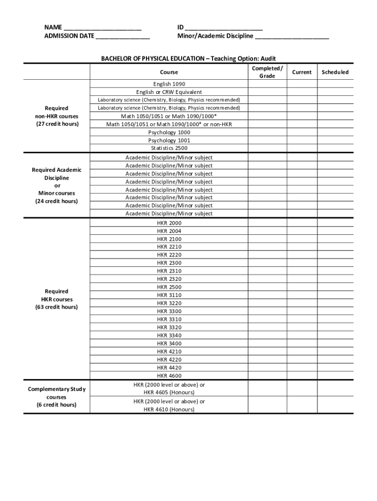 NAME ADMISSION DATE ID Minor/Academic Discipline BACHELOR OF PHYSICAL EDUCATION Teaching Option: Audit Course English 1090 English or CRW Equivalent Required nosher courses (27 credit hours)Required