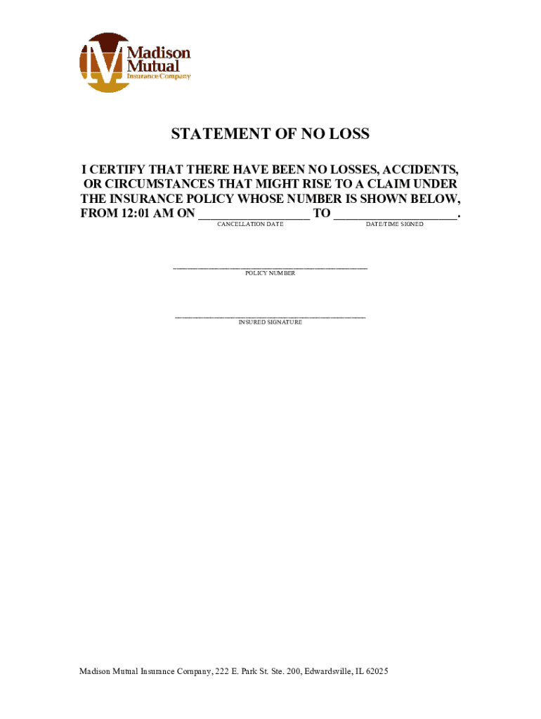 STATEMENT OF NO LOSS I CERTIFY THAT THERE HAVE BEEN NO LOSSES, ACCIDENTS, OR CIRCUMSTANCES THAT MIGHT RISE TO A CLAIM UNDER THE INSURANCE POLICY WHOSE NUMBER IS SHOWN BELOW, FROM 12:01 AM ON TO. CANCELLATION