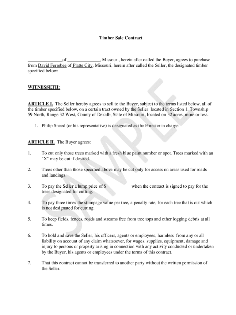 Timber Sale Contract of, Missouri, herein after called the Buyer, agrees to purchase from David Ferreted of Platte City, Missouri, herein after called the Seller, the designated timber specified below:WITNESSED:ARTICLE