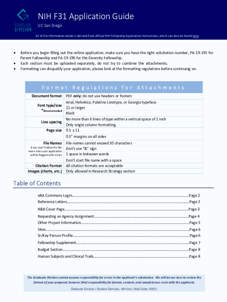 NIH F31 Application Guide UC San Diego All the information below is derived from official NIH Fellowship Application Instructions, which can also be found here. Before you begin filling out the online