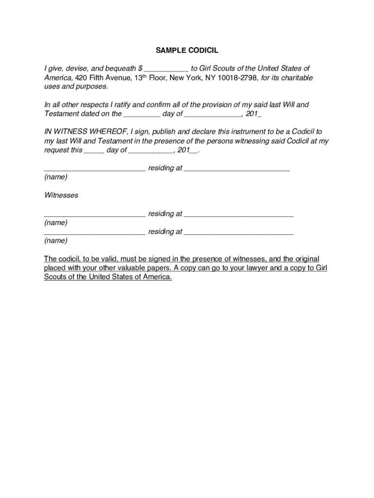 SAMPLE CODICIL I give, devise, and bequeath $ to Girl Scouts of the United States of America, 420 Fifth Avenue, 13th Floor, New York, NY 100182798, for its charitable uses and purposes. In all other