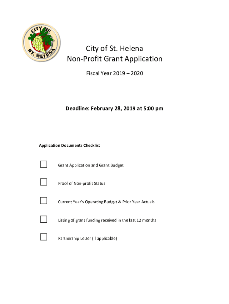 Citrons. Helena NonProfitGrantApplication FiscalYear20192020Deadline:February28,2019at5:00pmApplicationDocumentsChecklistGrantApplicationandGrantBudgetProofofNonprofitStatusCurrentYear 'sOperatingBudget&PriorYearActualsListingofgrantfundingreceivedinthelast12monthsPartnershipLetter(inapplicable)AttCityofSt.