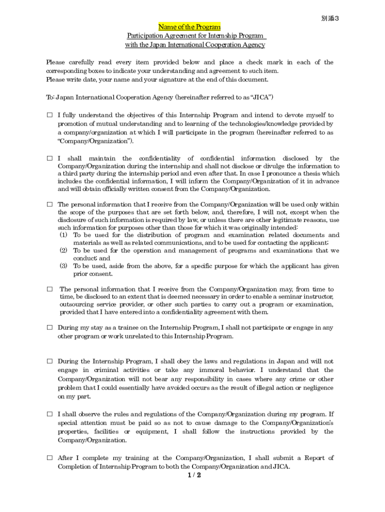 Name of the Program Participation Agreement for Internship Program with the Japan International Cooperation Agency Please carefully read every item provided below and place a check mark in each of