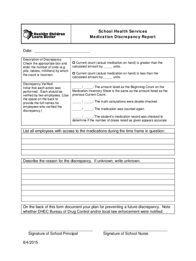 Get the free School Health Services Medication Discrepancy Report Date: List all ... - ed sc