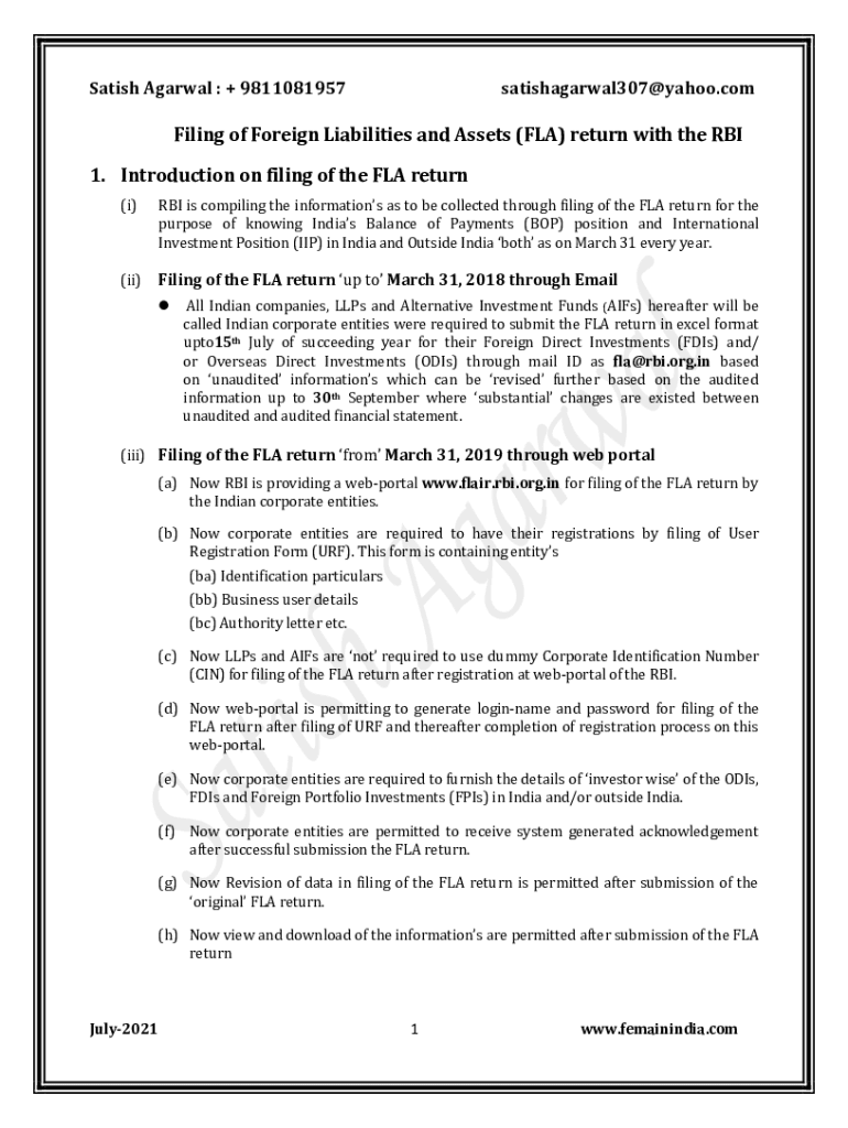 Salish Agarwal : + 9811081957satishagarwal307@yahoo.comFiling of Foreign Liabilities and Assets (FLA) return with the RBI 1. Introduction on filing of the FLA return (i) (ii)RBI is compiling the information