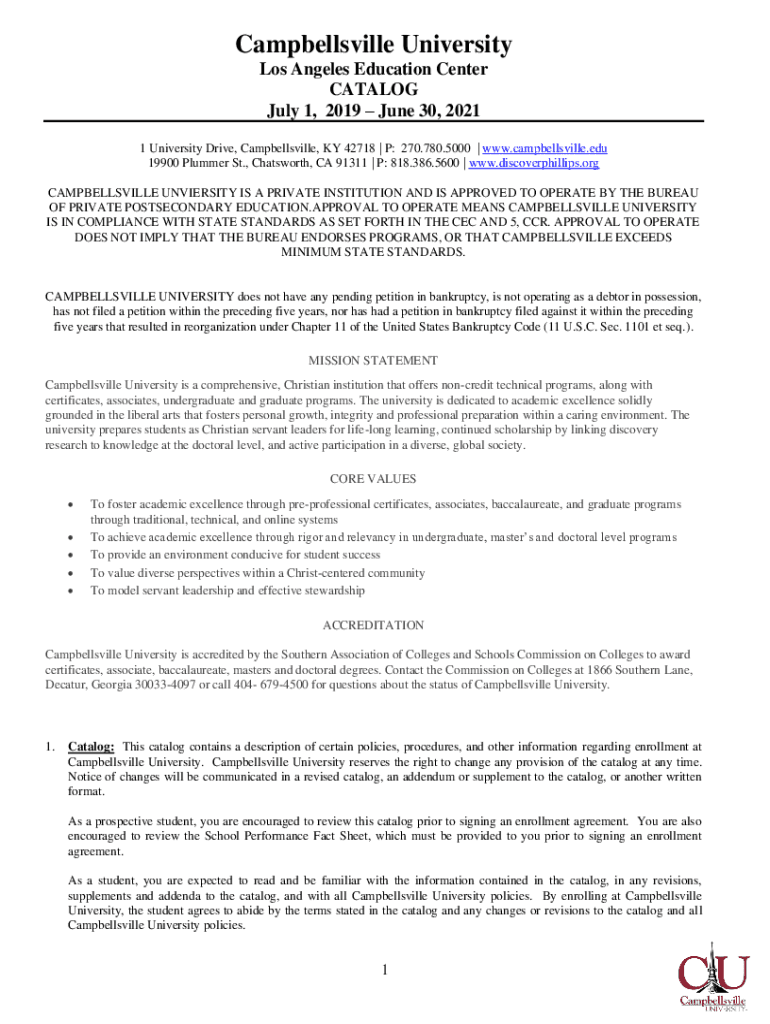Campbellsville University Los Angeles Education Center CATALOG July 1, 2019, June 30, 2021 1 University Drive, Campbellsville, KY 42718 P: 270.780.5000 www.campbellsville.edu 19900 Plummer St., Chats