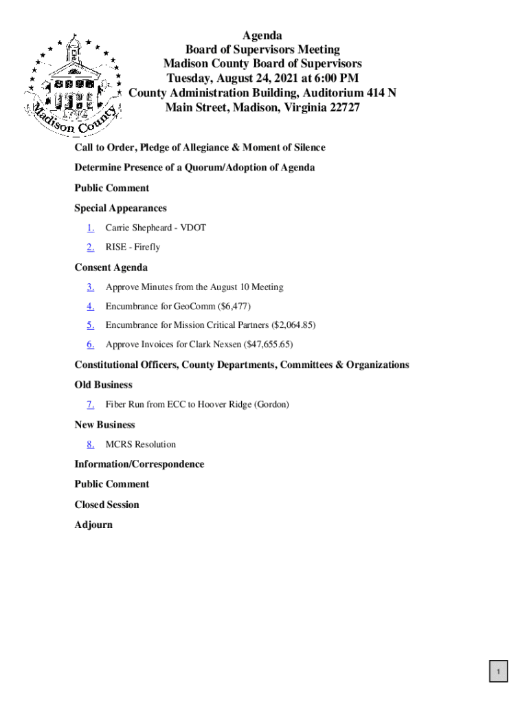 Agenda Board of Supervisors Meeting Madison County Board of Supervisors Tuesday, August 24, 2021, at 6:00 PM County Administration Building, Auditorium 414 N Main Street, Madison, Virginia 22727 Call