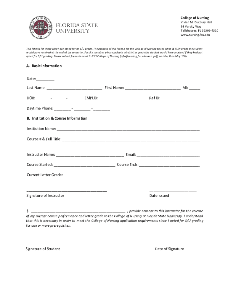 Form Directions This form is only necessary for those applying or admitted to the College of Nursing BSN Program, who have opted for an S/U grade in one or more BSN Program prerequisites. Course Instructor: