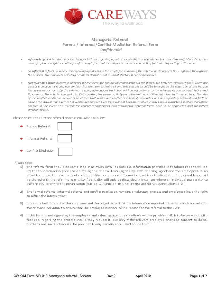 Managerial Referral: Formal / Informal/Conflict Mediation Referral Form Confidential A formal referral is a dual process during which the referring agent receives advice and guidance from the Airways