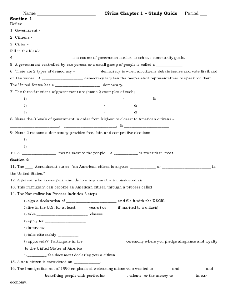 Name Section 1Civics Chapter 1 Study GuidePeriod Define 1. Government 2. Citizens 3. Civics Fill in the blank. 4. is a course of government action to achieve community goals. 5. A government controlled