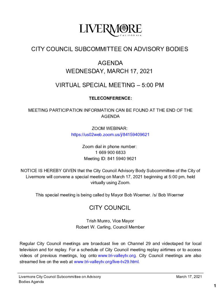 CITY COUNCIL SUBCOMMITTEE ON ADVISORY BODIES AGENDA WEDNESDAY, MARCH 17, 2021, VIRTUAL SPECIAL MEETING 5:00 PM TELECONFERENCE: MEETING PARTICIPATION INFORMATION CAN BE FOUND AT THE END OF THE AGENDA
