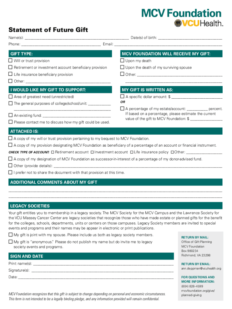 Statement of Future Gift Name(s): Date(s) of birth: Phone: Email: GIFT TYPE:MTV FOUNDATION WILL RECEIVE MY GIFT:Will or trust provisionUpon my deathRetirement or investment account beneficiary provisionUpon