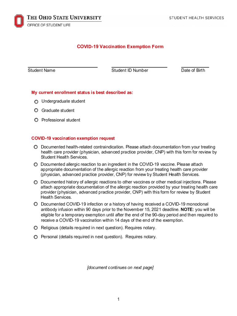 COVID-19 Vaccination Exemption FormStudent NameStudent ID Numerate of Birth current enrollment status is best described as: Undergraduate student Graduate student Professional studentCOVID19 vaccination