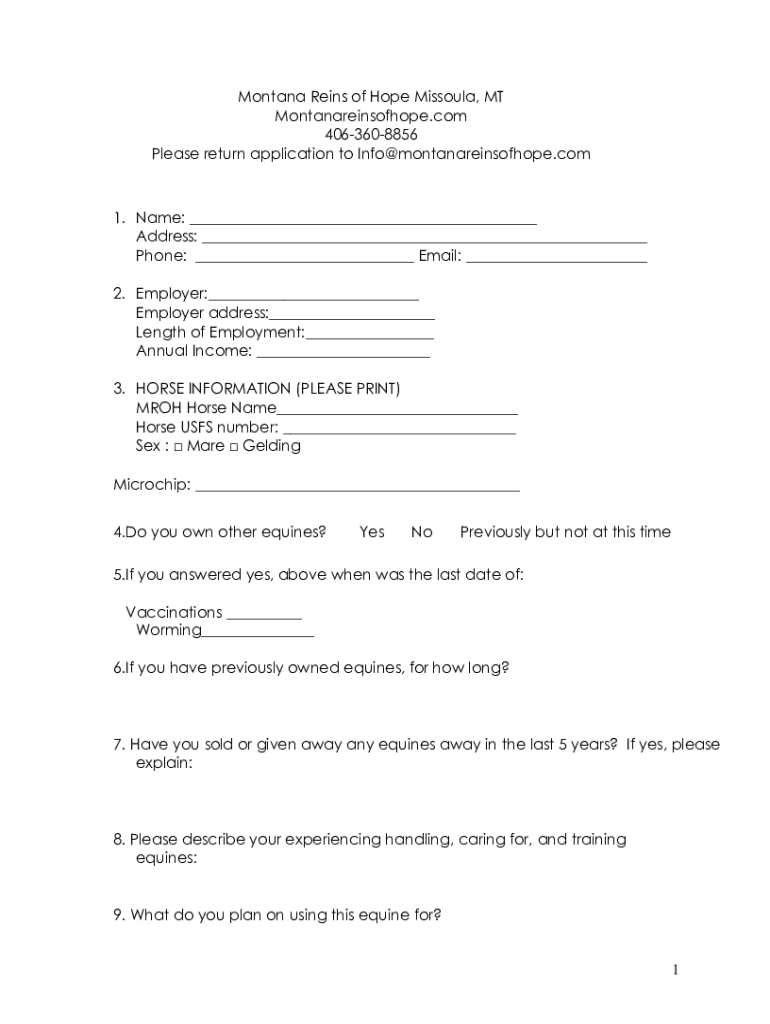 Montana Reins of Hope Missoula, MT Montanareinsofhope.com 4063608856 Please return application to Info montanareinsofhope.com1. Name: Address: Phone: Email: 2. Employer: Employer address: Length of