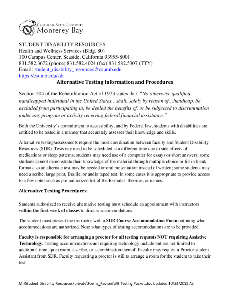 STUDENT DISABILITY RESOURCES Health and Wellness Services (Bldg. 80) 100 Campus Center, Seaside, California 939558001 831.582.3672 (phone) 831.582.4024 (fax) 831.582.5307 (TTY) Email: student_disability_resources@csumb.edu