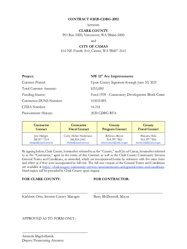 CONTRACT #2020CDBG2002 between CLARK COUNTY PO Box 5000, Vancouver, WA 986665000 and CITY OF CAMPS 616 NE Fourth Ave, Camps, WA 986072165Project:NW 12th Ave ImprovementsContract Period:Upon County