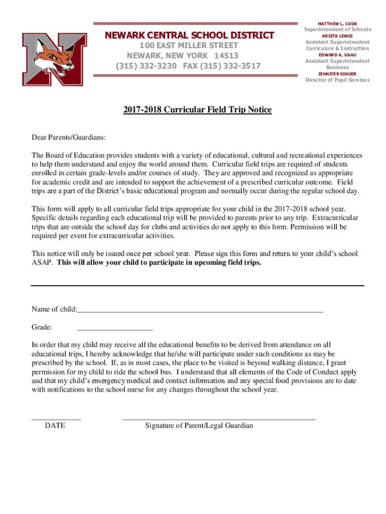 Parents or guardians of students enrolled in Newark Central School District are required to file any necessary documentation related to enrollment, attendance, and performance.