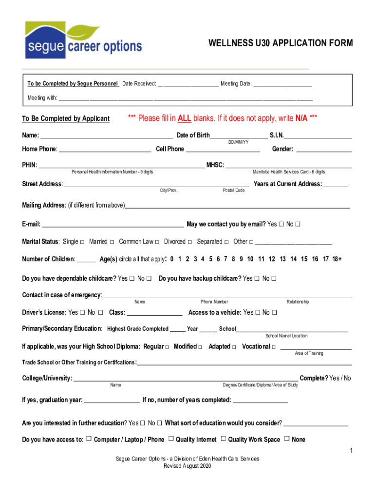 WELLNESS U30 APPLICATION Form be Completed by Segue Personnel Date Received: Meeting Date: Meeting with: *** Please fill in ALL blanks. If it does not apply, write N/A ***To Be Completed by ApplicantName: