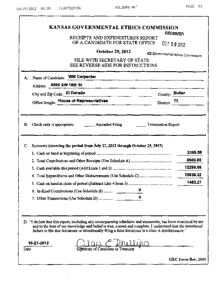 10/29/201208:35PAGElJ I BURS HKT1520752378501KANSAS GOVERNMENTAL ETHICS COMMISSION RECEfVEDRECEWTS AND EXPENDITURES REPORT OF A CANDIDATE FOR STATE OFFICE OCT October 29 2012292012KS Governmental