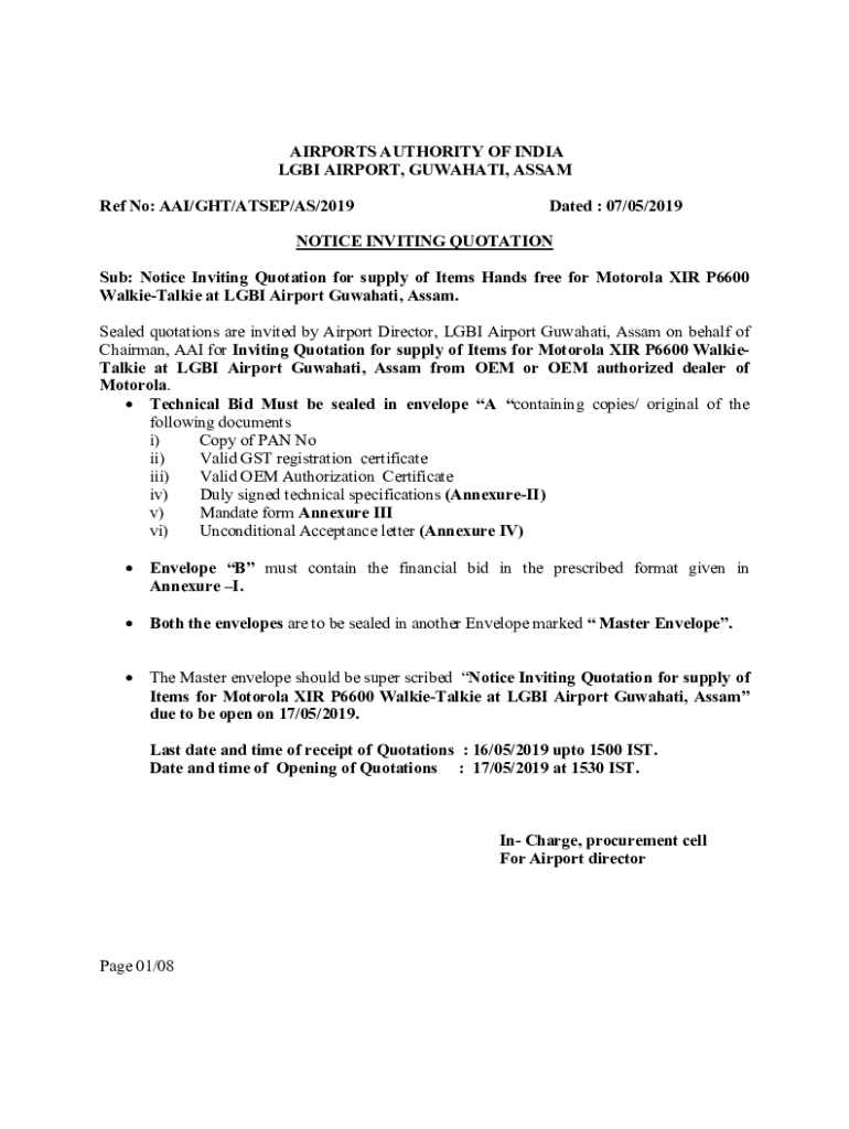AIRPORTS AUTHORITY OF INDIA LBI AIRPORT, GUWAHATI, ASSAM Ref No: AAI/GHT/AFSEP/AS/2019Dated : 07/05/2019NOTICE INVITING QUOTATION Sub: Notice Inviting Quotation for supply of Items Hands free for