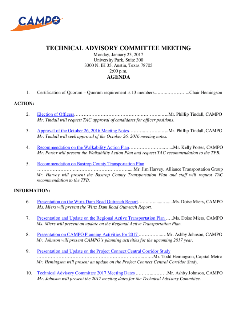 TECHNICAL ADVISORY COMMITTEE MEETING Monday, January 23, 2017, University Park, Suite 300 3300 N. IH 35, Austin, Texas 78705 2:00 p.m.AGENDA 1. Certification of Quorum requirement is 13 members......
