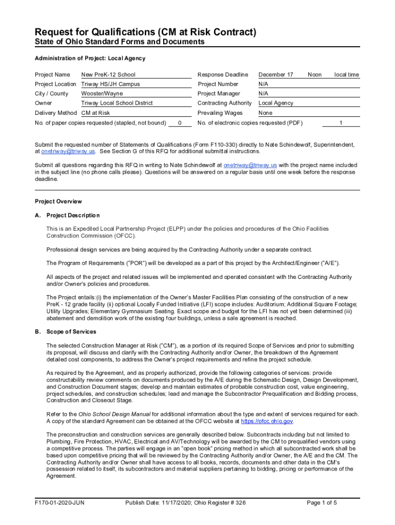 Request for Qualifications (CM at Risk Contract) State of Ohio Standard Forms and Documents Administration of Project: Local Agency Project Name PreK12 SchoolResponse Deadline December 17Project Location