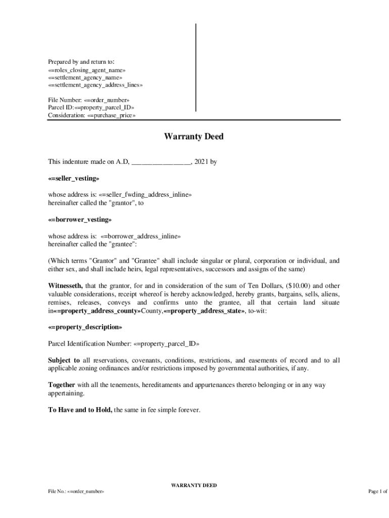 Prepared by and return to: roles closing agent name settlement agency name settlement agency address lines File Number: order number Parcel ID:property parcel ID Consideration: purchase priceWarranty