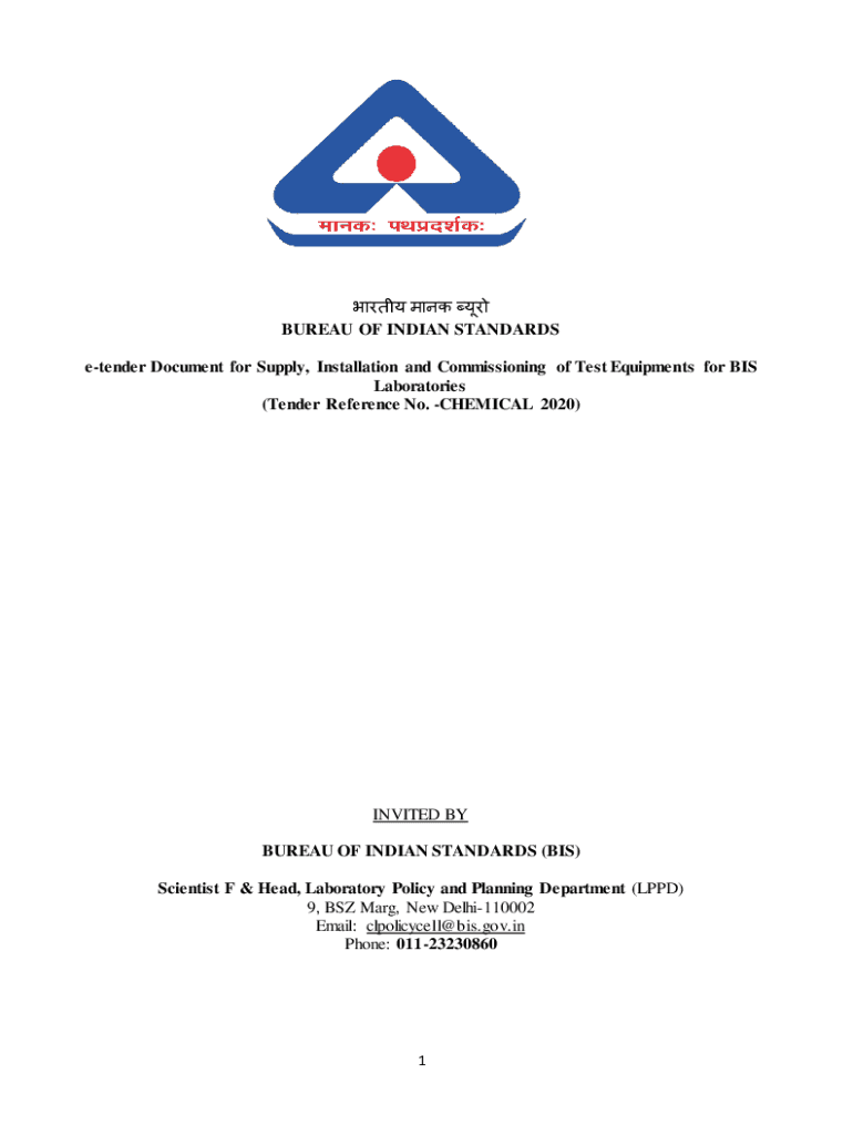 BUREAU OF INDIAN STANDARDS tender Document for Supply, Installation and Commissioning of Test Equipments for BIS Laboratories (Tender Reference No. CHEMICAL 2020)INVITED BY BUREAU OF INDIAN STANDARDS
