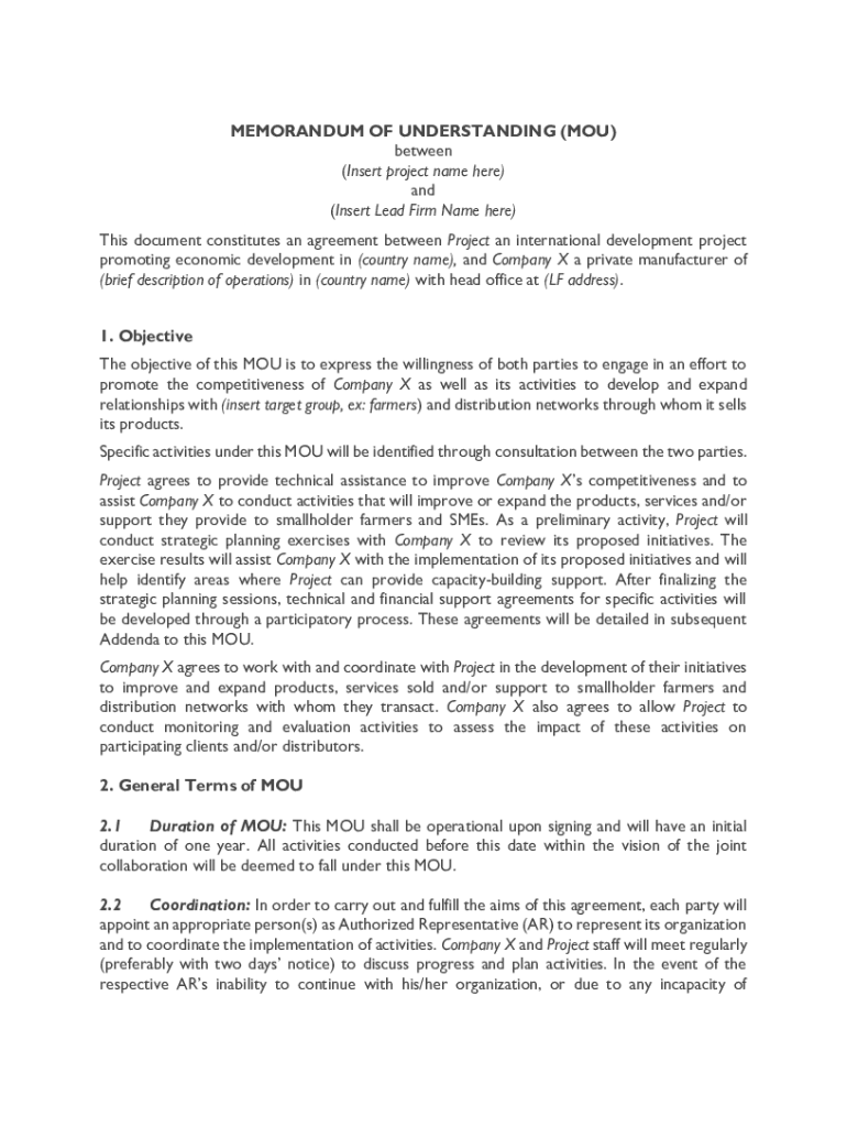 MEMORANDUM OF UNDERSTANDING (YOU) between (Insert project name here) and (Insert Lead Firm Name here) This document constitutes an agreement between Project an international development project promoting