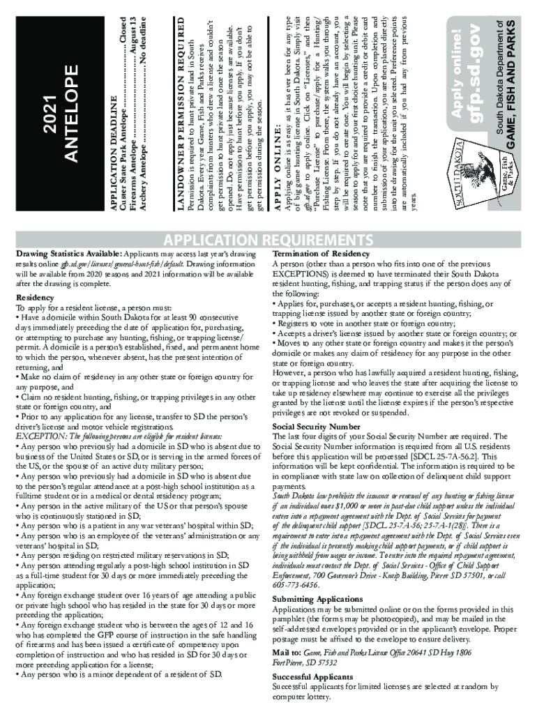 South Dakota Department game, FISH AND Parks.SD.apply online! Applying online is as easy as it has ever been for any type of big game hunting license in South Dakota. Simply visit gap.SD.gov to apply