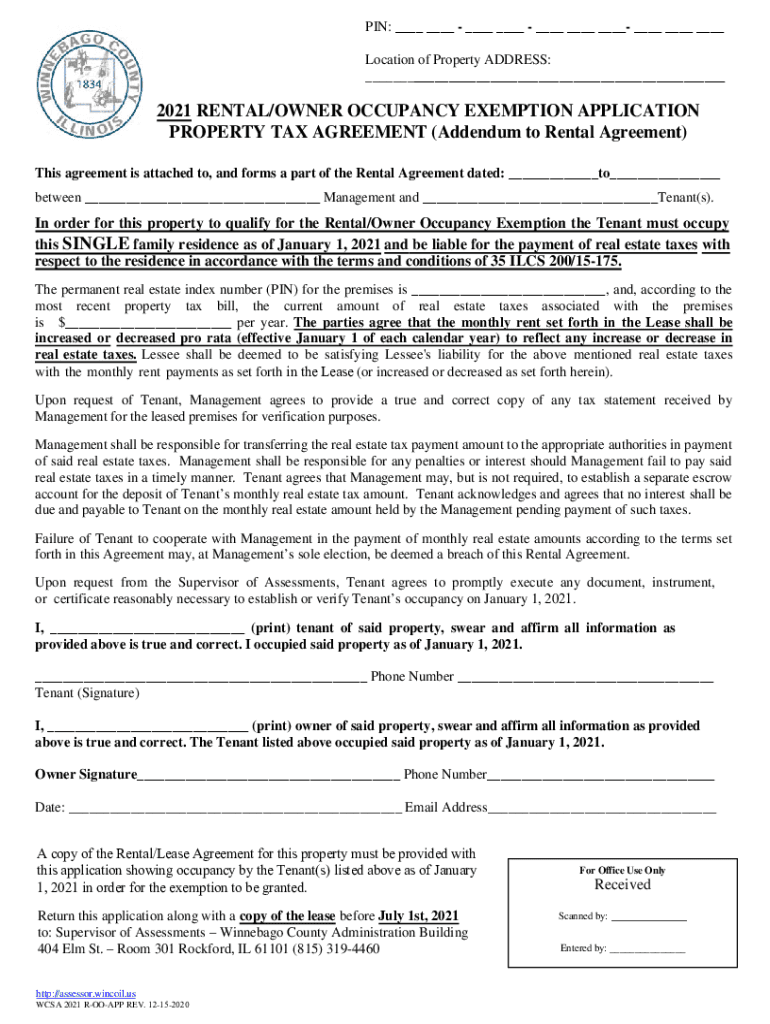 PIN: Location of Property ADDRESS: 2021 RENTAL/OWNER OCCUPANCY EXEMPTION APPLICATION PROPERTY TAX AGREEMENT (Addendum to Rental Agreement) This agreement is attached to, and forms a part of the Rental