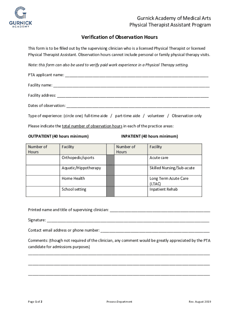 Garrick Academy of Medical Arts Physical Therapist Assistant Program Verification of Observation Hours This form is to be filled out by the supervising clinician who is a licensed Physical Therapist