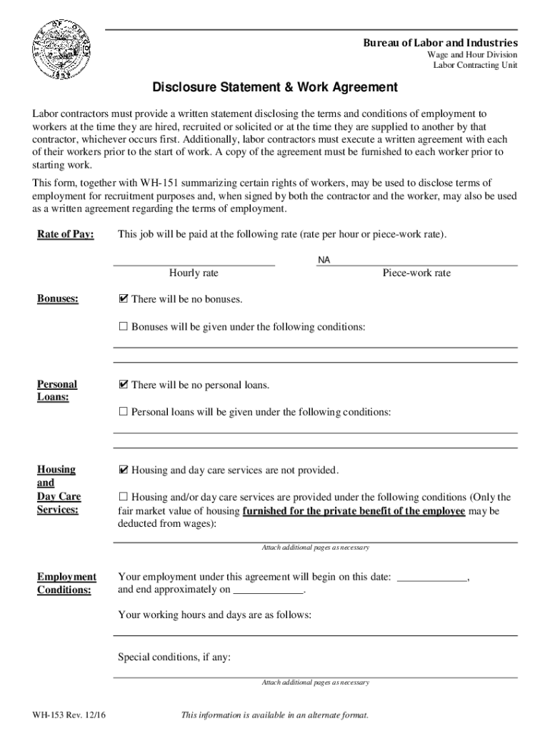 Bureau of Labor and Industries Wage and Hour Division Labor Contracting Nondisclosure Statement & Work Agreement Labor contractors must provide a written statement disclosing the terms and conditions