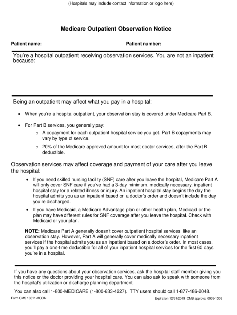 (Hospitals may include contact information or logo here)Medicare Outpatient Observation Notice Patient name:Patient number:You're a hospital outpatient receiving observation services. You are not