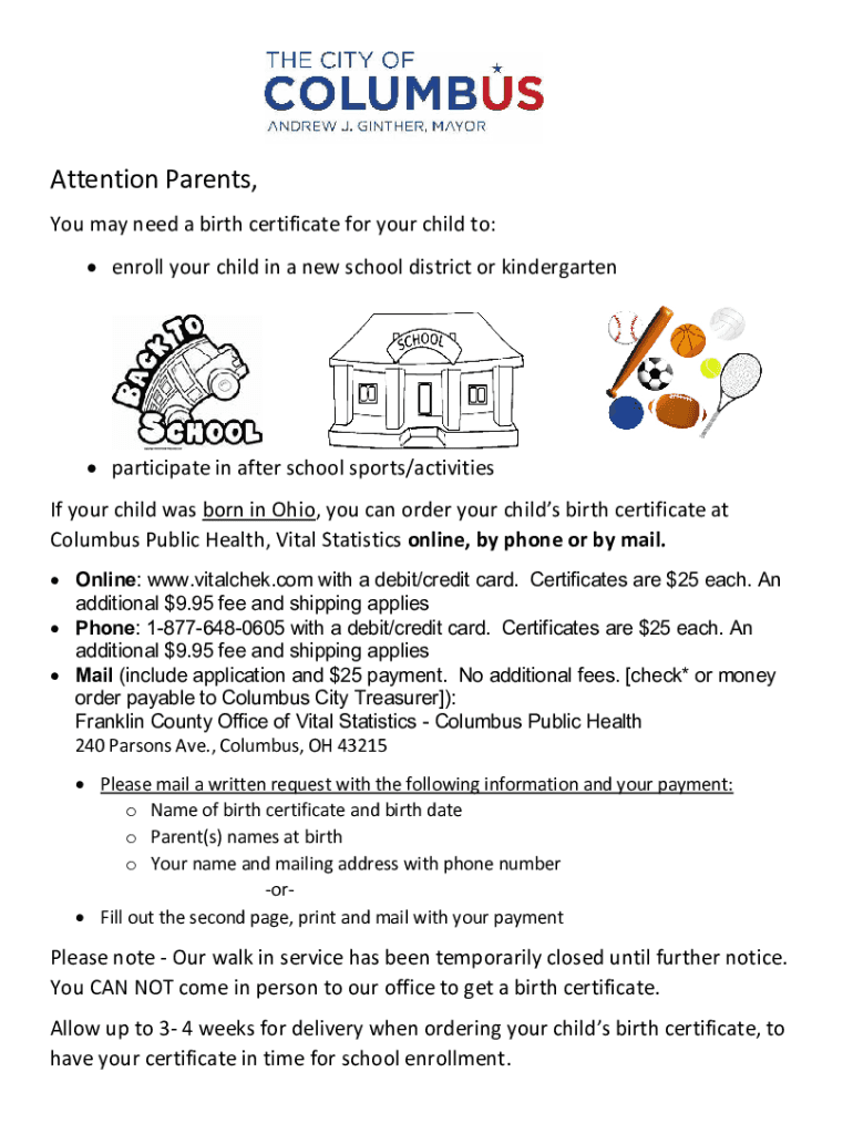 Attention Parents, You may need a birth certificate for your child to: enroll your child in a new school district or kindergarten participate in after school sports/activities If your child was born