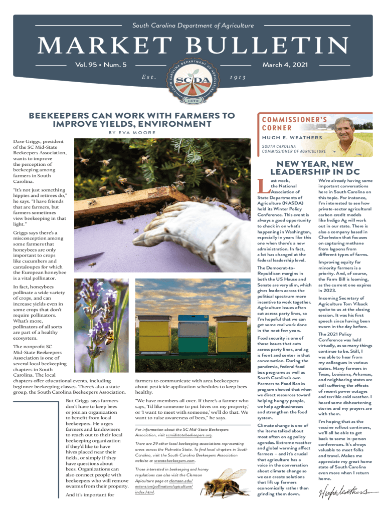 South Carolina Department of AgricultureMARKET BULLETIN Vol. 95 Sum. 5March 4, 2021 Est.1913BEEKEEPERS CAN WORK WITH FARMERS TO IMPROVE YIELDS, ENVIRONMENT BY EVA MOORED ave Griggs, president of the
