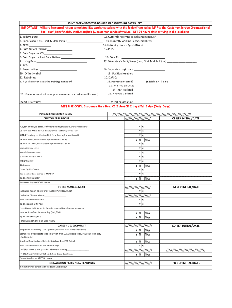 JOINT BASE ANACOSTIABOLLING PROCESSING DATASHEETIMPORTANT: Military Personnel return completed IDA worksheet along with the folder from losing MPH to the Customer Service Organizational box: USAF.banana.