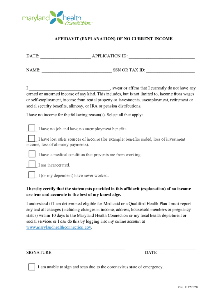 AFFIDAVIT (EXPLANATION) OF NO CURRENT INCOME DATE: APPLICATION ID: NAME: SSN OR TAX ID: I, swear or affirm that I currently do not have any earned or unearned income of any kind. This includes, but