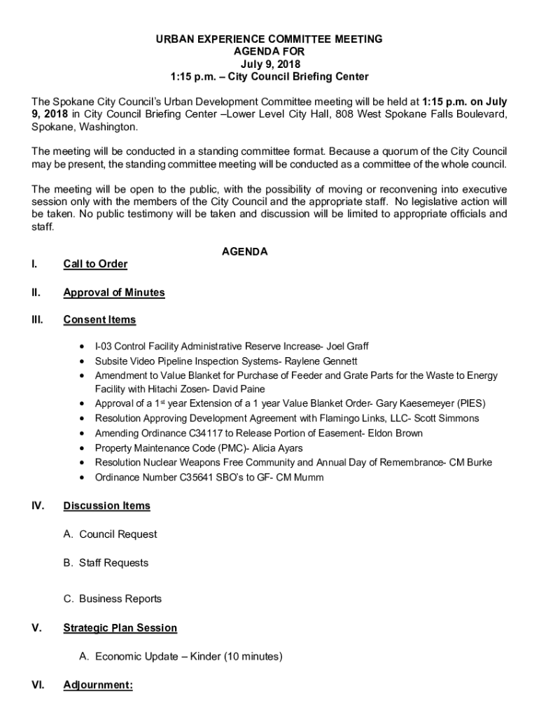 URBAN EXPERIENCE COMMITTEE MEETING AGENDA FOR July 9, 2018 1:15 p.m. City Council Briefing Center The Spokane City Councils Urban Development Committee meeting will be held at 1:15 p.m. on July 9,