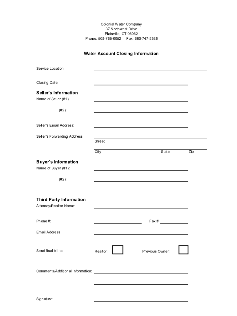 Colonial Water Company 37 Northwest Drive Blainville, CT 06062 Phone: 5087850052 Fax: 8607472536Water Account Closing Information Service Location:Closing Date:Seller\'s Information Name of Seller