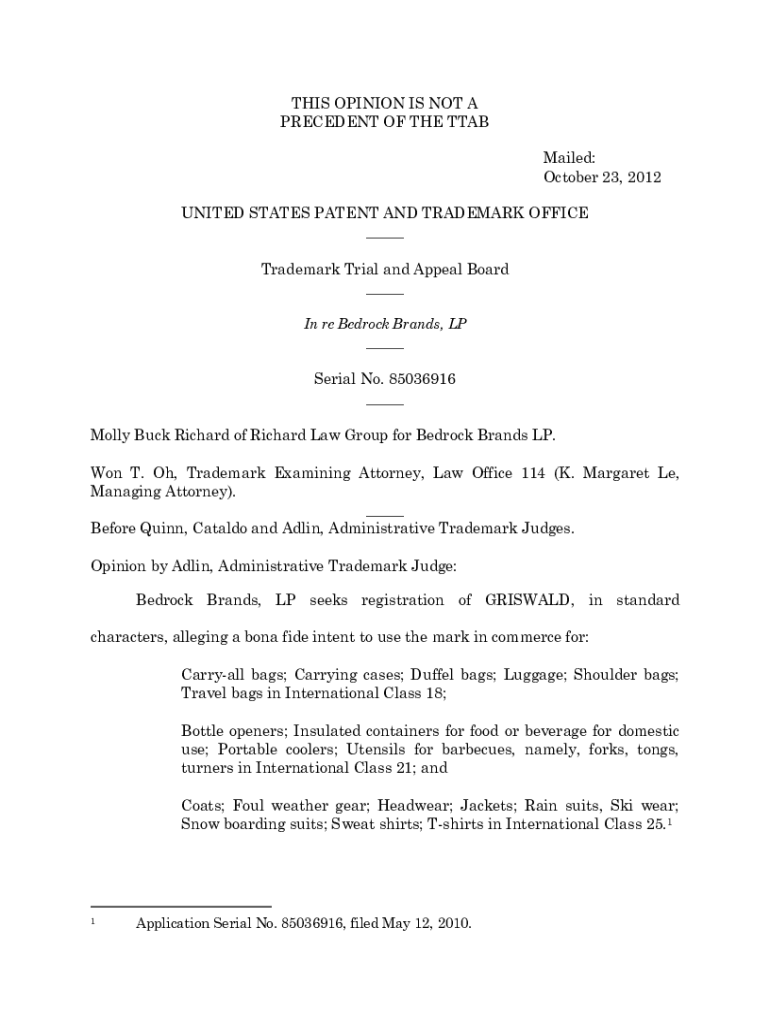 THIS OPINION IS NOT A PRECEDENT OF THE STAB Mailed: October 23, 2012, UNITED STATES PATENT AND TRADEMARK OFFICE Trademark Trial and Appeal Board In re Bedrock Brands, LP Serial No. 85036916 Molly