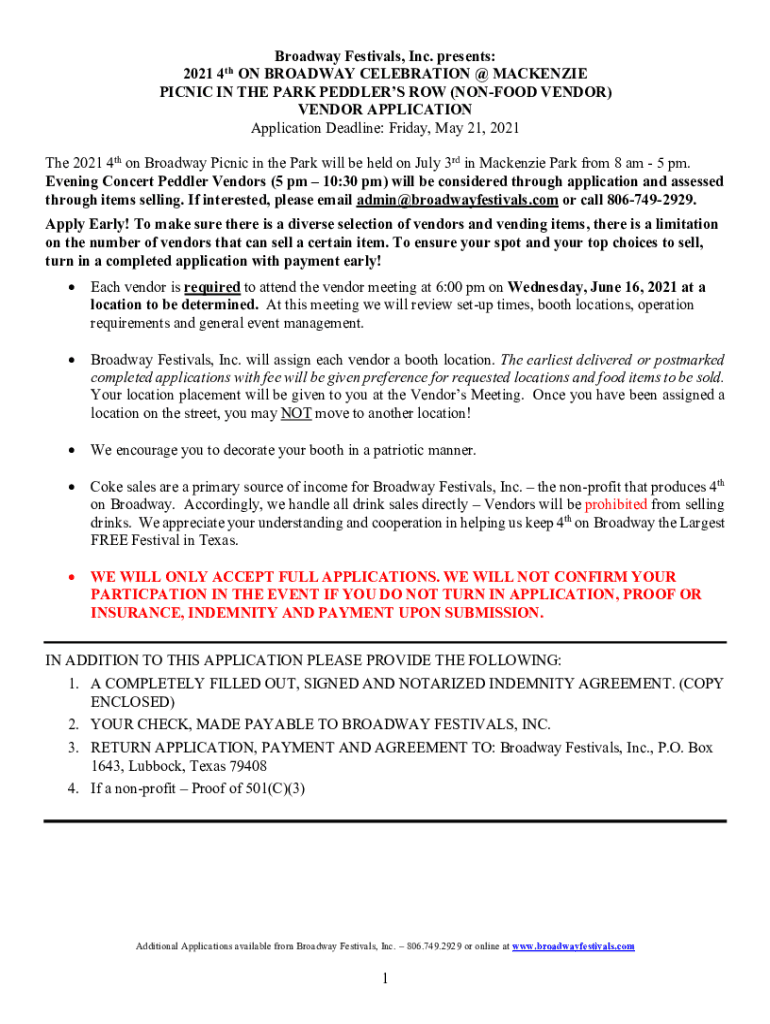 Broadway Festivals, Inc. presents: 2021 4 ON BROADWAY CELEBRATION MACKENZIE PICNIC IN THE PARK PEDDLERS ROW (NONFOOD VENDOR) VENDOR APPLICATION Deadline: Friday, May 21, 2021, tithe 2021 4th on Broadway