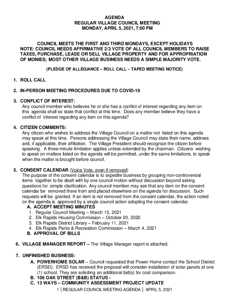 AGENDA REGULAR VILLAGE COUNCIL MEETING MONDAY, APRIL 5, 2021, 7:00 PM COUNCIL MEETS THE FIRST AND THIRD MONDAYS, EXCEPT HOLIDAYS NOTE: COUNCIL NEEDS AFFIRMATIVE 2/3 VOTE OF ALL COUNCIL MEMBERS TO