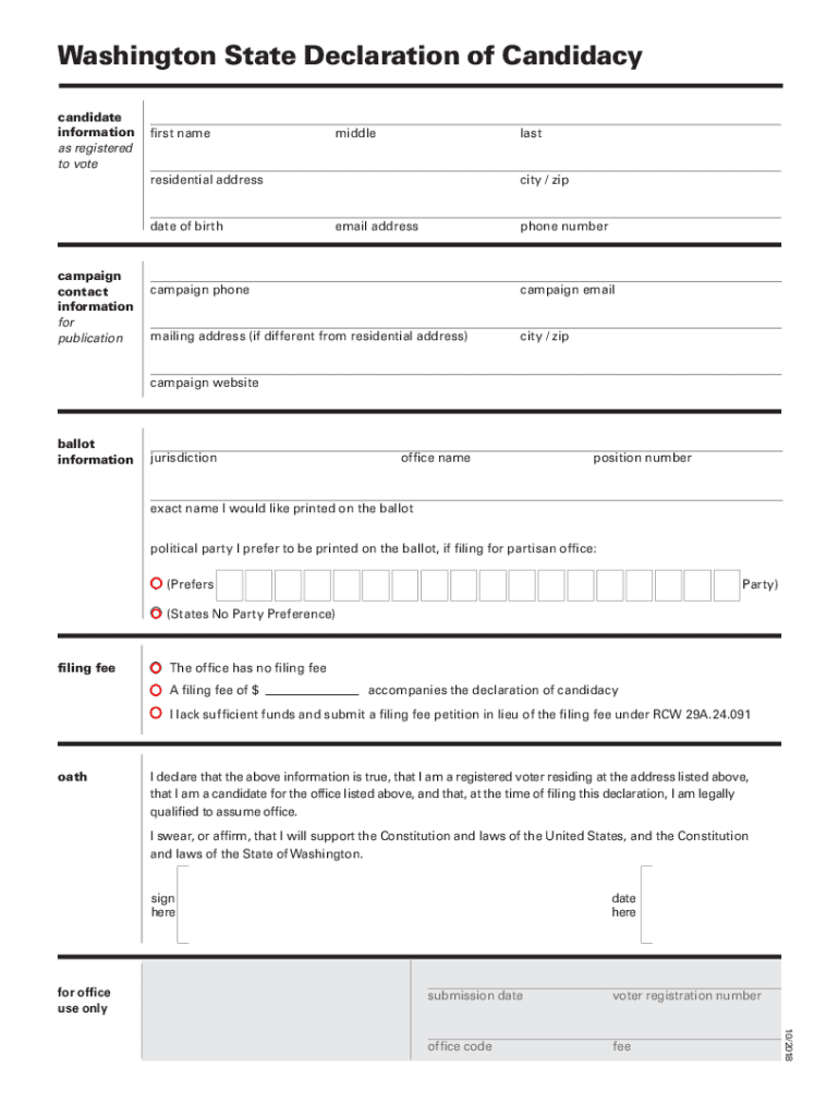 Washington State Declaration of Candidacy candidate information as registered to vote campaign contact information for publication first namemiddlelastresidential address city / zip date of birth