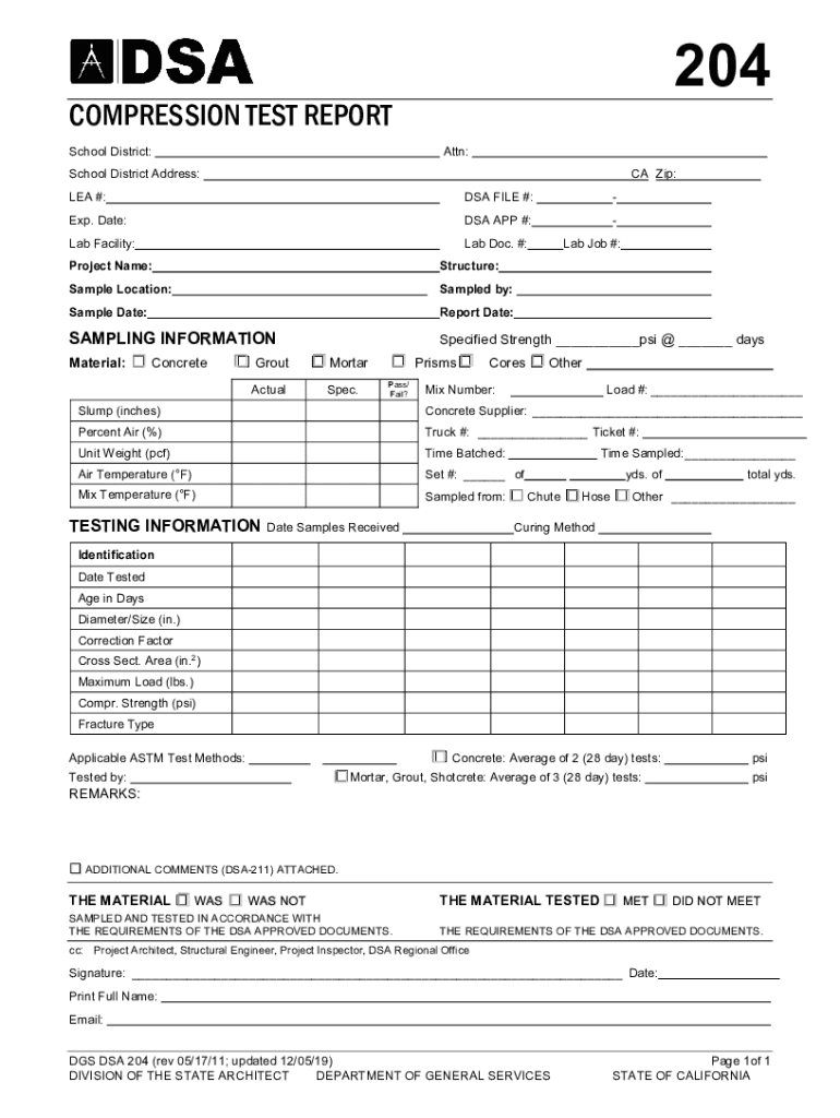 204COMPRESSION TEST REPORT School District:Attn:School District Address:CA Zip:LEA #:DSA FILE #:Exp. Date:DSA APP #:Lab Facility:Lab Doc. #:Lab Job #:Project Name:Structure:Sample Location:Sampled