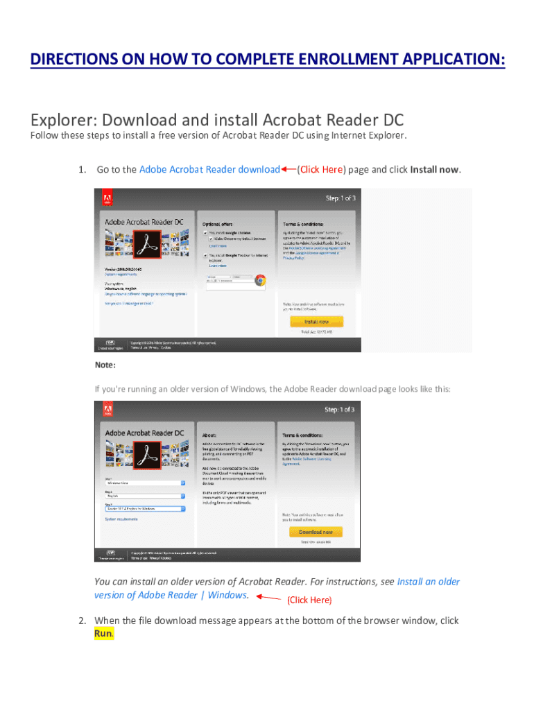 DIRECTIONS ON HOW TO COMPLETE ENROLLMENT APPLICATION:Explorer: Download and install Acrobat Reader Follow these steps to install a free version of Acrobat Reader DC using Internet Explorer. 1. Go