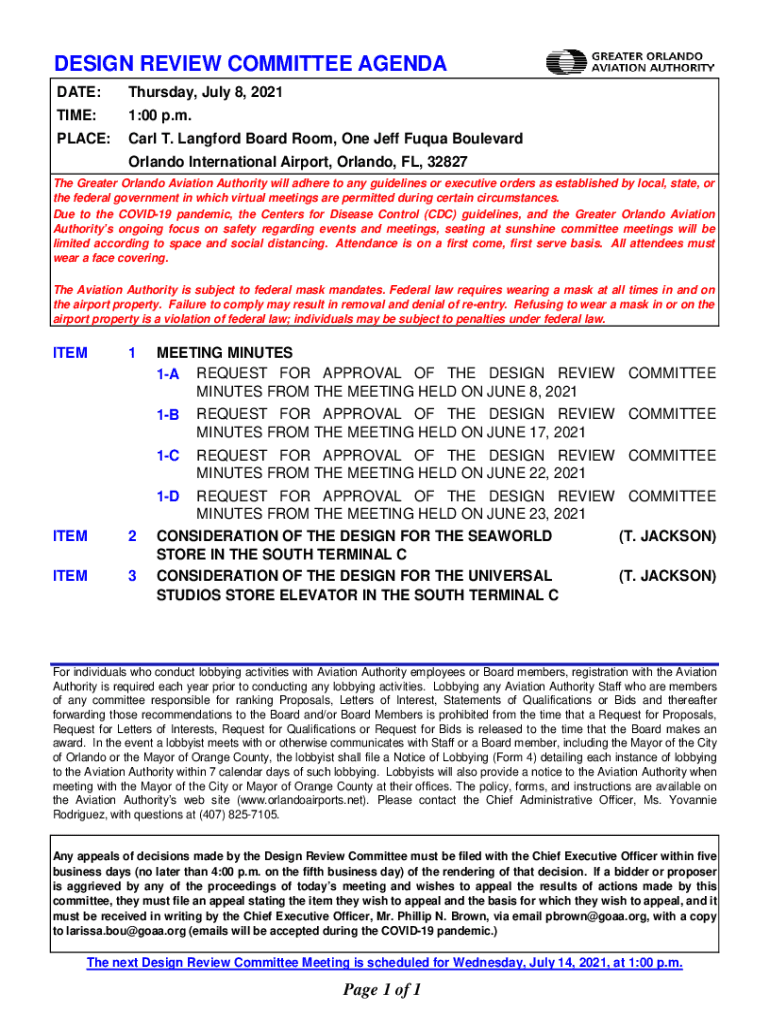 DESIGN REVIEW COMMITTEE AGENDA DATE:Thursday, July 8, 2021TIME:1:00 p.m.PLACE:Carl T. Langford Board Room, One Jeff Aqua Boulevard Orlando International Airport, Orlando, FL, 32827The Greater Orlando