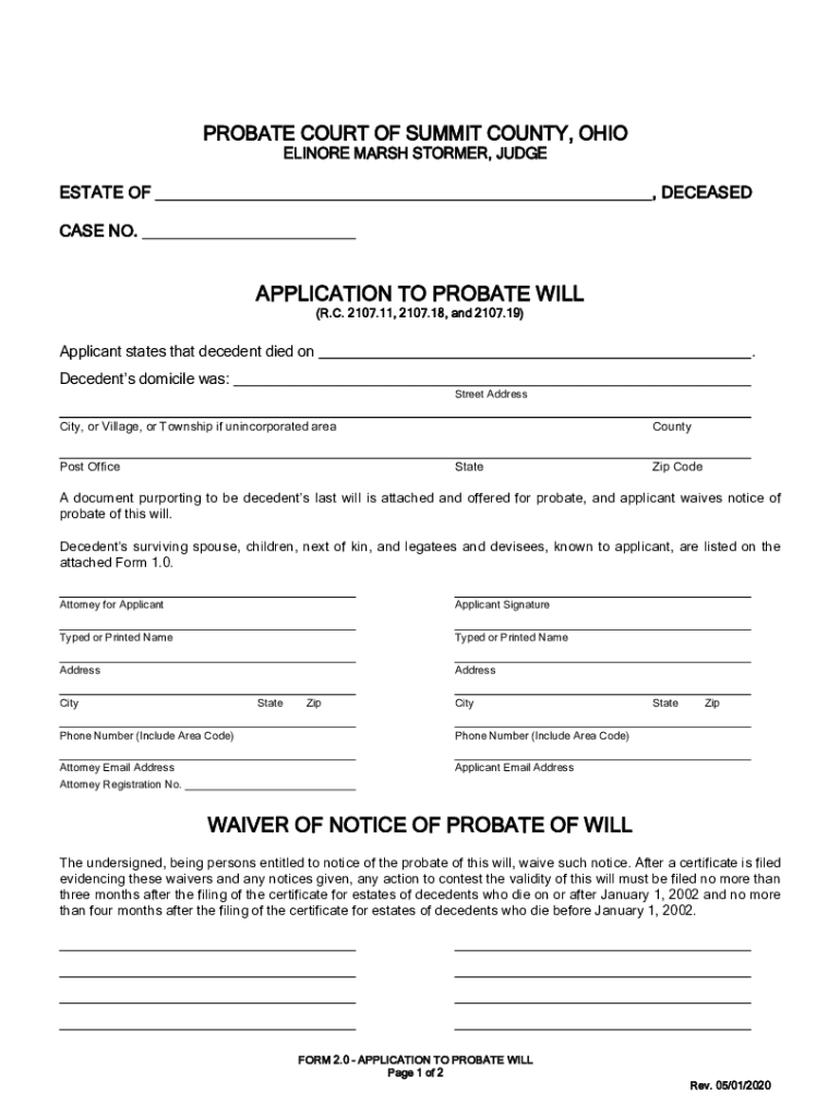 Reset Reprobate COURT OF SUMMIT COUNTY, OHIO ELINOR MARSH STORMED, JUDGEESTATE OF, DECEASED CASE NO.APPLICATION TO PROBATE WILL (R.C. 2107.11, 2107.18, and 2107.19). Applicant states that decedent