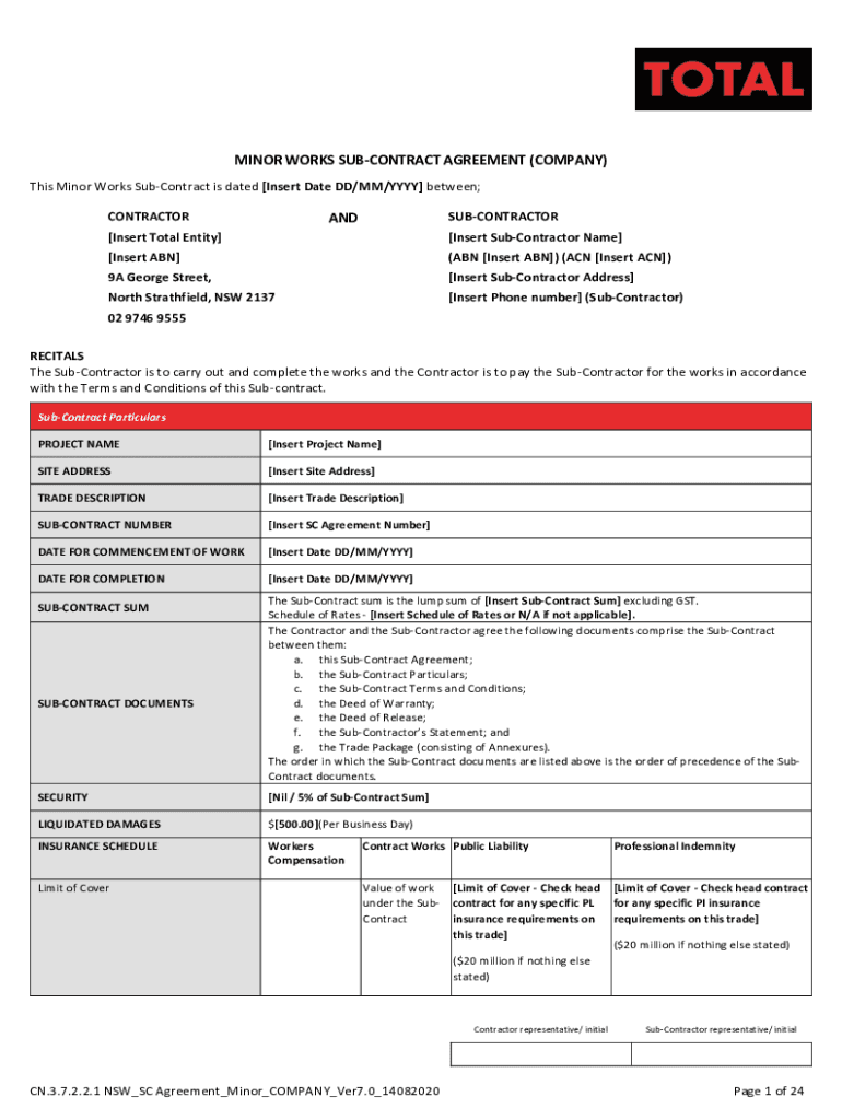 MINOR WORKS SUBCONTRACT AGREEMENT (COMPANY) This Minor Works SubContract is dated Insert Date DD/MM/YYY between; CONTRACTORSUBCONTRACTORAND Insert Total Entity Insert SubContractor Name Insert ABN
